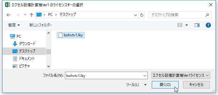 手順1でコピーしたライセンスキーファイルを選択し、右下の[開く]ボタンをクリックします。